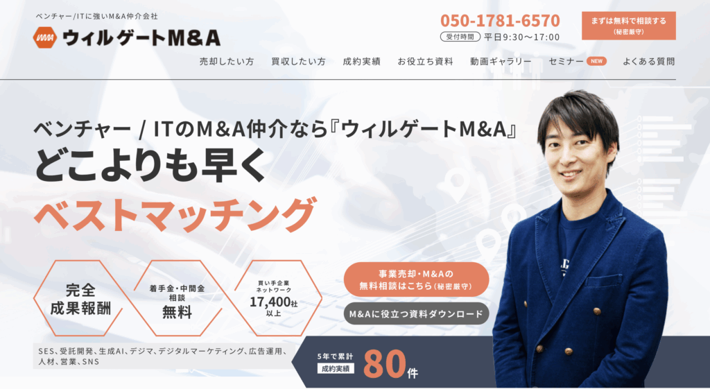 株式会社ウィルゲートは、SEOによるコンテンツマーケティングを中核としている企業ですが、IT・Web事業に特化したM&A仲介サービス「Willgate M&A」も展開しています。同社は完全成果報酬型を採用しています。また、17,400社以上の経営者ネットワークを有しているため、IT・Web事業の最適なM&Aを低コストかつスピーディーに実現することができます。